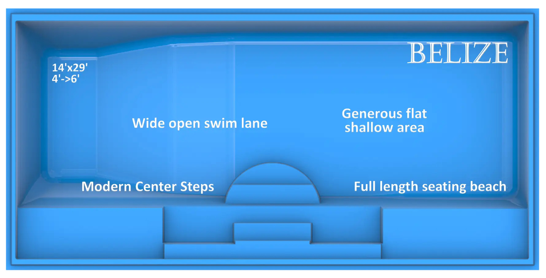 The Belize combines a sleek rectangular profile with a versatile flat-bottom depth that works for all ages. Built-in bench seating offers the perfect place to relax while the wide swim lane makes it easy to swim laps or play with family. Crafted in America with premium fiberglass, the Belize is designed for lasting beauty and low-maintenance enjoyment.