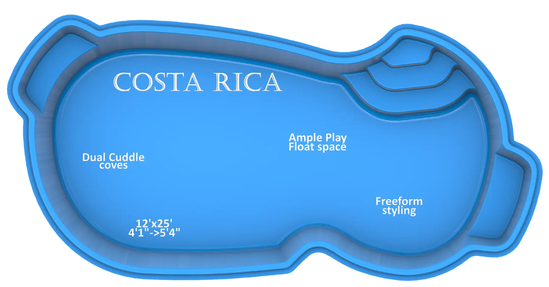 The Costa Rica fiberglass pool was designed with comfort and family fun in mind. Its freeformr layout offers plenty of space for swimming, playing, or simply lounging in the sun. It’s a pool that feels equally at home as the centerpiece for backyard gatherings or as a private retreat for quiet evenings.