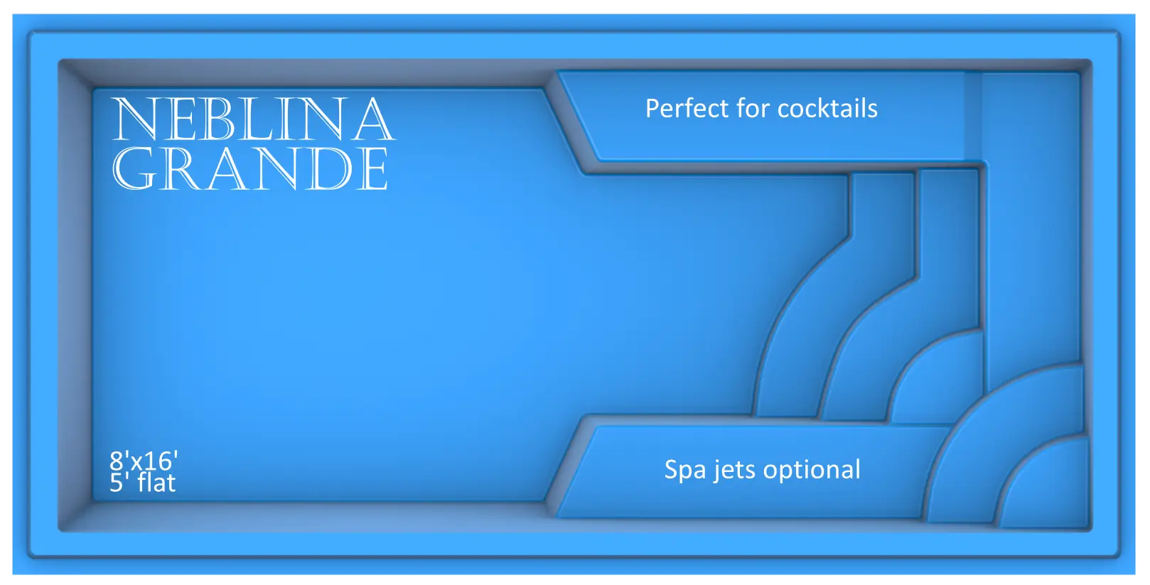 Beyond its beauty, the Neblina Grande is built with American-made fiberglass that resists algae growth, requires less maintenance, and stays cooler to the touch in hot weather. This durability means you spend more time enjoying the pool and less time on upkeep—an investment designed to last for decades.