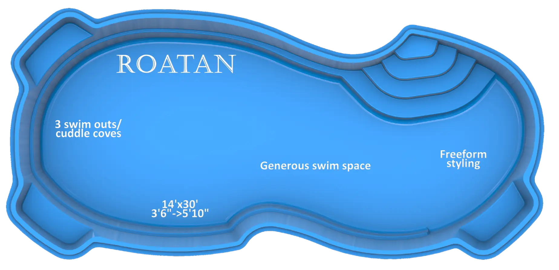 The Roatan fiberglass pool blends freeform styling with generous swim space, making it ideal for both family fun and elegant entertaining. With three built-in cuddle coves and a safe depth profile, it offers plenty of room for swimming, lounging, and relaxing in style.