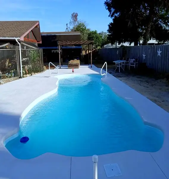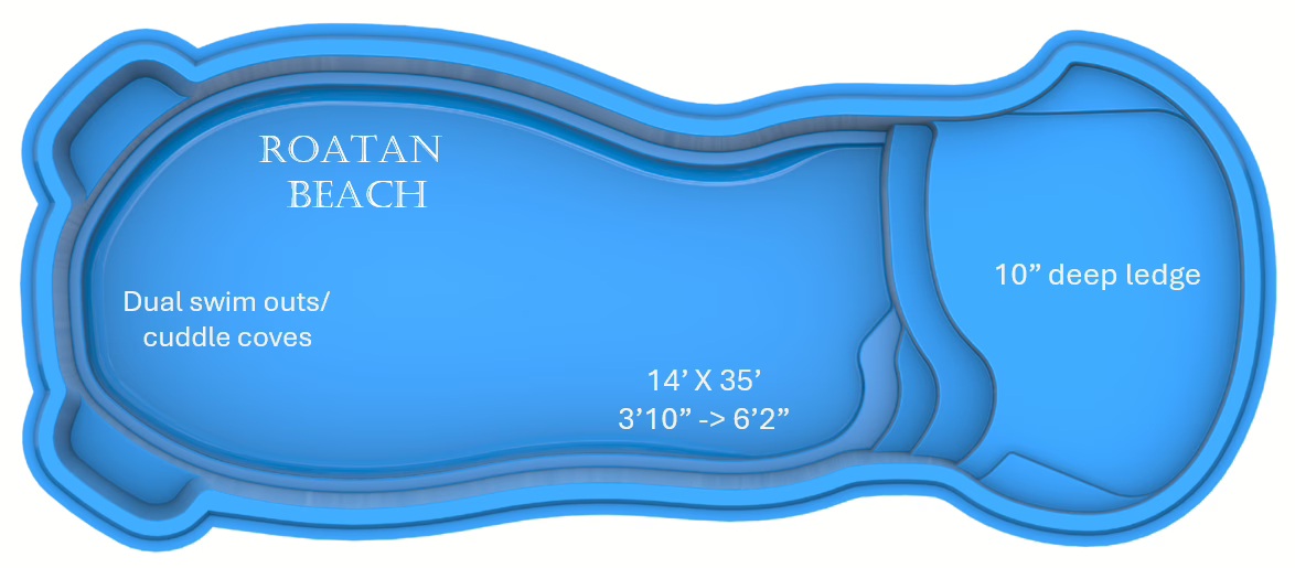 The Roatan Beach fiberglass pool combines freeform curves with practical swim features, including dual cuddle coves, a generous 10” deep ledge, and a family-friendly depth profile ranging from 3’10” to 6’2″.